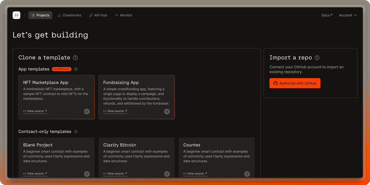 The Hiro Platform offers multiple ways to create projects, whether you're starting from scratch with a template or importing an existing repository. This guide will walk you through both approaches.